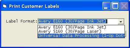 Click on Print, Customer Listings, Labels to print labels on any customer records. You can run this program at any time you choose. One common use for the labels would be for attachment to the new meter reading sheets each year. The program has been written for Avery 8160 laser 30 per page, the Avery 5160 inkjet 30 per page or standard one acress dot matrix labels. You have options as to the order for printing and whether you want the customer address or the Alternate Billing Address. This print program provides numerous options for selecting the order of printing, such account number order, customer name order, bar code order, route sequence, and printing from a user designed grid. Each of these will be explained below.
