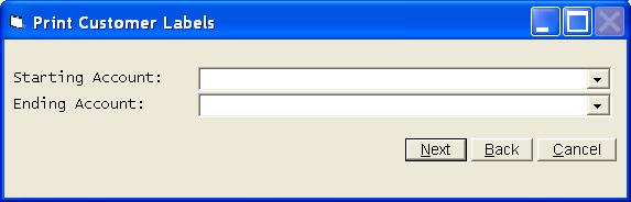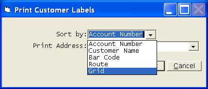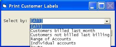 All Labels This will print labels on all customer records in the file. Customers billed last billing This option will print only the customers who were billed during the last billing cycle. The last billing date is already known and you will immediately be asked the type of labels you are using. Customers not billed last billing This option will print labels for all customers who were not billed during the last billing cycle. Range of Accounts This will allow you to pick a lowest and a highest Account Number for printing. The system will print those two and all accounts in between. Individual Accounts This option is perfect for picking just one or two labels for print or reprint, but if you have numerous reprints you should consider printing a Range of Labels. Route Sequence This will allow you to print all labels for customers who have a specific Route Number. Grid You have a menu option called grids. This option will allow you to design and build grids containing any information you choose from the customer records. The grid routines have autofilter options that allow you to limit the customers on the grid by any criteria in the customer record. For example, you could build a grid that contained the customer number (always show the customer number first to use this feature), customer name, and water rate codes. Suppose you had a standard letter you wanted to send to all commercial customers. You could use the autofilter option and limit the customers to only the commercial customers. Once he grid contains just the customers you want, you can save the grid. That is where this print labels from grid option becomes very handy. You can select this option and the system will print labels for all customers that were left showing on your grid (in this example only the commercial customers). | |