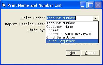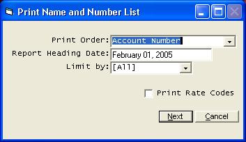 This program prints the Customer Number, Customer Name, and Meter Address of all customers in the Customer File. This listing can then be used for assigning new customer numbers, etc. This program can be run at any time. If you select a numeric listing, the report will be printed in Customer Number sequence. If you select Customer Name sequence, the report will be printed in alphabetic order based on the Alpha Sort Field in each customer's record. If you wish to obtain this alpha listing, be sure to enter the customer's name in the Alpha Sort Field as you add each customer's record to the file. Normally you will enter the customer's first name first in the master record, but you should enter their last name in the Alpha Sort Field. Street Sequence You also have an option to print in Street Sequence or Street Sequence - Auto Reversed. Normally as enter the street address, you would enter the number and then the street name, such as 103 North Sycamore. The only problem is that when you print a listing in street order, all of the 103's are listed together, instead of the North Sycamore's. If you use the auto-reverse order, the system will temporarily turn the addresses around so all North Sycamores are grouped together. This could be very useful if you need to know who lives down a street or highway, etc. Grid Sequence You have a menu option called grids. This option will allow you to design and build grids containing any information you choose from the customer records. The grid routines have auto-filter options that allow you to limit the customers on the grid by any criteria in the customer record. For example, you could build a grid that contained the customer number (always show the customer number first to use this feature), customer name, and water rate codes. Suppose you needed a list of all commercial customers. You could use the auto-filter option and limit the customers to only the commercial customers. Once he grid contains just the customers you want, you can save the grid. That is where this name and number list becomes very handy. You can select this option and the system will print a name and number listing for all customers that were left showing on your grid (in this example only the commercial customers). Route Sequence The route sequence will print the entire name listing in route/sequence order. | |