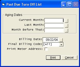 The Past Due and Turn Off List is a list of all customers who were past due as of the date the report was run. It contains the same information as the Past Due Notices, which can be mailed to customers. If an account has a balance in excess of $1.00, that account will be listed. The number of asterisks (*) beside the balance indicates the number of months past due. For example, three asterisks (***) would indicate 90 days old. You will be asked three aging dates. Normally these would be the last day of the month, but it does not have to be. The last billing date must be the same date that was used when the bills were last calculated. | |