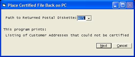 As explained in other sections of this manual, this Utility Billing system can print a postal bar code at the bottom of the Utility Bills. The customer addresses must be certified every six months. To do this, you must send a copy of the addresses to ACS for certification. To send the addresses, see Create Certification File. Once these addresses have been certified and returned to you, use this Place Certified File Back On PC option to place the bar codes back on your PC. Place the returned certification file diskette in the selected drive before you continue. | |
