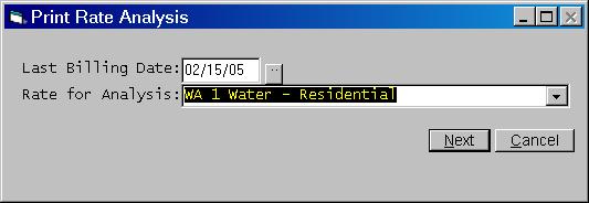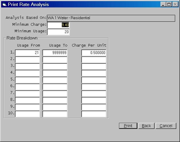 This rate analysis program can be run at anytime. It will assist in analyzing your rate structures, usage, and revenues. It will also allow you to project revenues by entering hypothetical rates and running these rates against actual usage. This report will show the usage and dollars generated by each category of your rate structure. The system will use the usage from the most recent month in these calculations. Enter the service you wish to analyze.