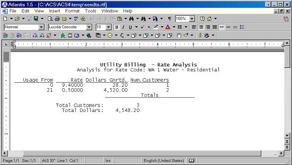 Your current rates will automatically be displayed. We suggest you run the program one time with these current rates and compare the answers to the last billing journal to see that you get the same totals for each rate code. This will insure that you are answering the questions correctly and that the routines are working properly with your rate structure. Once you are sure the answers are correct with your current rates, you can begin experimenting with different rates. For example, if you needed to increase revenues by $10,000.00, you could increase the rates on the above screen by a certain amount and then see what affect it has on the total dollars generated. Remember, this calculation is only for the previous billing date. Do not change your real rates. Only change the rates on the screens within this program. Once it has been determined that the rates should be changed, you will use the "Rates" option from the menu to change your actual rates. The report will look similar to the one shown below.