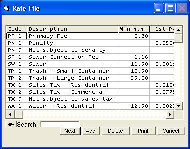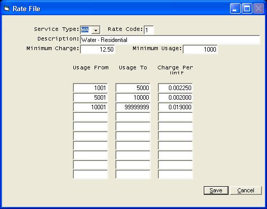 All rates can be maintained from the Rate file menu found under Files on the main Utility Billing menu. The rates will initially be entered by ACS, but you can use this option to change rates or enter any new rates. Accessing Existing Records The first screen will display a list of all codes that are contained in the rate file. To access any existing rate code, highlight the rate code and press enter or click Next. The above table is for residential water. There is a $12.50 minimum charge. You get 1000 gallons usage for the minimum charge. The next 4000 gallons are at $2.25 per thousand. From 5001 to 10000 gallons, the rate is $2.00 per thousand. Note that the last bracket shows the usage to 99999999. Always be sure to enter enough nines to cover the maximum usage that any one customer can have. Note that in the above example the meter readings are expected to have all digits read. The rates are thus entered as a charge per gallon. The $2.00 per thousand rate is entered as .002000 (pointed off 3 positions). You can enter the table to match the way the readings are turned in. For example, if you drop off three digits on the readings (reading thousands only), your usage fields above would read something like 1 to 5 and 6 to 10 ect. The $2.00 rate would be entered as 2.00 . The minimum usage would be 1 . Add New Records You will use the Add option from the first screen to add a new rate table to the system. As you add a new rate code, You will have a list of all applicable codes for your system. Locate the Service Type for the service you are adding. You must enter a rate code. Use any numeric code between 1 and 99, but of course the system will not allow you to use a code that has been used before. Delete The Delete button will delete the highlighted record. Be careful not to delete any rate code that is currently being used. The print option will print a proof listing of the entire rate file. | |