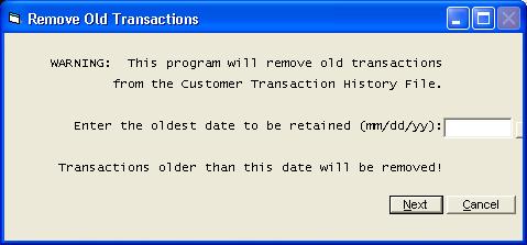 All customer transactions are stored in a Transaction File. This file contains transactions for collections, billings, penalties, memos, etc. The transactions continue to accumulate each time a transaction is processed on any customer. This is very useful when you are researching some history on any customer. All reports in the system look to this file any time transactions are listed or aging is done, etc. You should always keep a several year's history, but at some point the file will become so large that processing will be slowed. At that point you will need a way to dump some of the older history. That is the purpose of this Remove Old Transactions program. You will be asked the oldest date to be retained. All transactions with a date older than the date entered will be removed from the system. For example, suppose the year is 2005 and you want to retain history for the last three years, you would enter a date of 01/01/02, indicating you want to dump all transactions dated before that date. All other users must be out of Utility Billing before you start this routine. We suggest you have a good backup before you start in case of a power failure, etc. The system can not operate without this Transaction file. | |