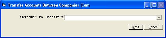 This menu option can be used to transfer customer records from one company to another company. Normally this would occur when you have set up a second company to hold bad debts or written off accounts. The second company must be set up in advance before you can begin transferring accounts. By doing this transfer, you clear your files of written off accounts without completely destroying the account. You simply move it to the "Bad Debt" company and retain all information on it, including transactions. If, some day, you wish to set the record back up in your real files, simply transfer it back. If you happen to make a collection on an account that has been transferred to the bad debt company, simply transfer it back and process the collection in your real files. You must enter the account of each customer you want transferred to a different company. | |