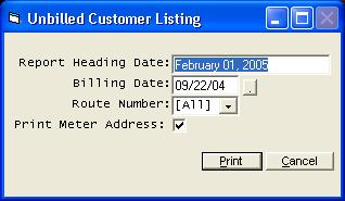 The Unbilled Customer Listing will print a report of all customers that were not billed during the last billing run. This report can be used to verify that no customers were inadvertently skipped. This program will normally be run immediately after all bills have been calculated. Be sure to enter the same date of billing that was used when the bills were calculated. Customer records that have matching dates will not be printed. Also, customers with a final billing code in their record will not be shown. Enter the book or route number if you wish to print only one route. Enter zero if you wish to print all routes that have been calculated. | |