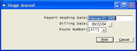 The usage report can be found under "Billing", then Print Reports, and then Usage Report. This listing shows the consumption for the current period and year-to-date. Also shown are totals by route and grand totals for all routes. Use of this report is optional, but we suggest you print it each billing cycle. If you Enter Readings from a handheld meter reading device, this may be the only hard copy of the reading you have. You can select to print only one route, or you can print all routes at one time. Even if you do select all routes, you will receive subtotals after each route. | |