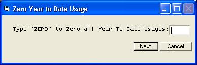 The purpose of this program is to bring the year-to-date usage fields to zero in each customer's record. This prepares the files for the start of a new year. Be sure the Final Usage Journal for the year has been printed before this program is run. To run this program, click on Year of End, and then Zero Year to Date Usage. Please note that you must type ZERO, rather than entering a 0. | |
